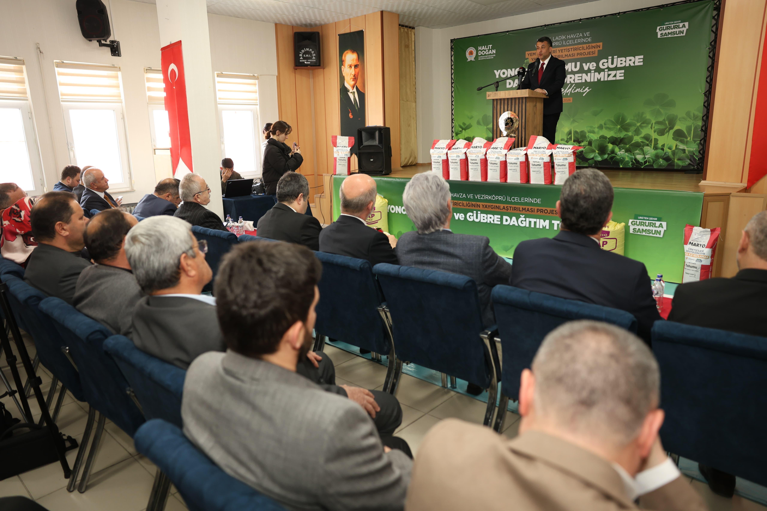 Tarımın şehri Samsun’da tarımsal üretimi ve üreticiyi her daim destekleyen Samsun Büyükşehir Belediyesi “Yem Bitkileri Yetiştiriciliğinin Yaygınlaştırılması Projesi” kapsamında Yonca Tohumu ve Gübre Dağıtım Töreni gerçekleştirdi. Samsun Büyükşehir Belediye Başkanı Halit Doğan, “Üreticimiz yeter ki üretsin. Biz her zaman, her koşulda onların yanında olmaya, yükünü paylaşmaya devam edeceğiz” dedi.